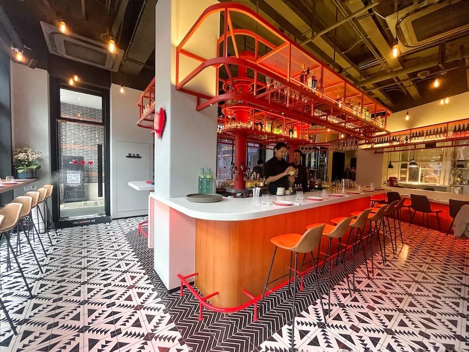 Geometric floor tiling in black and white allow the brand’s crimson logo to pop, accented by Cherrywood and warm lighting. It all feels very laid-back, like a neighborhood bar, until the food arrives.