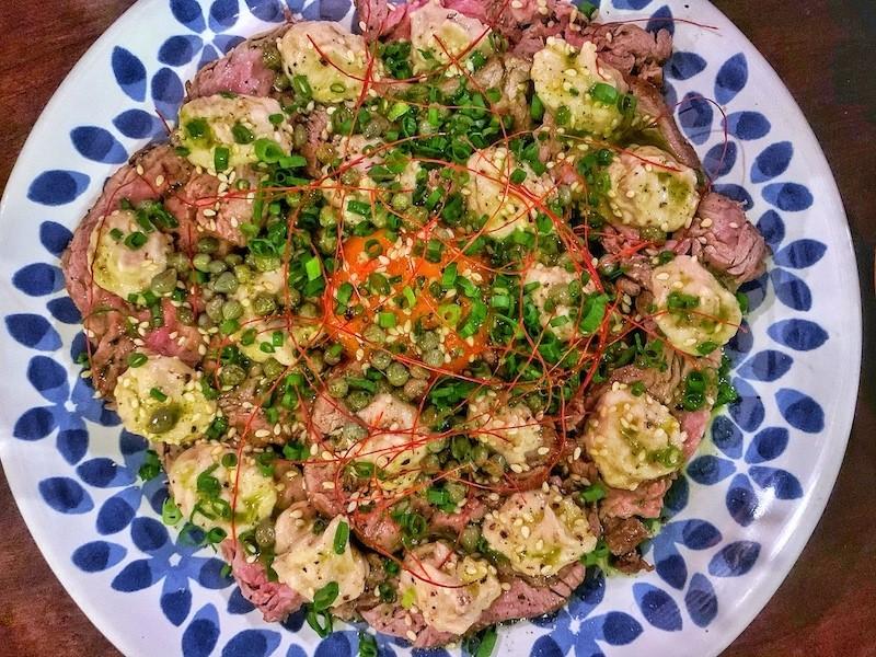 The Sliced Beef with Tuna Sauce (RMB118) is a French nod to the Italian Vitello Tonnato. Thinly sliced pieces of marinated beef are topped with a rich tuna sauce and loads of capers for a briny bite balanced by a refreshing drizzle of herb oil.