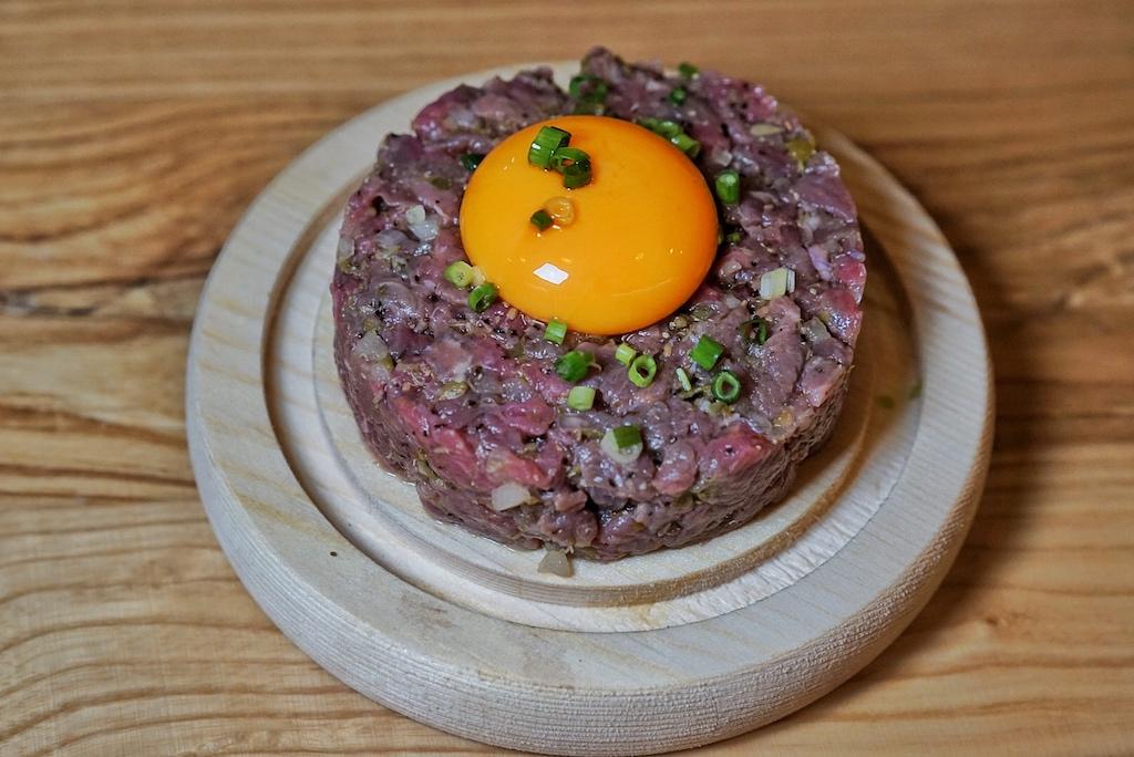 Post-lemon tart baking, the Beef Tartart (RMB99) (yes, that’s how it’s spelled on the menu) arrives tableside covered by a smoke-filled glass cloche – we guess for gimmicky presentation purposes, since it added nothing to the bland flavor of the dish. The grey-tinged meat is topped with an egg yolk and a sprinkling of chopped scallions, but crying out – alone in the dark – for mustard, mayo or just any kind of sauce or seasoning out there.