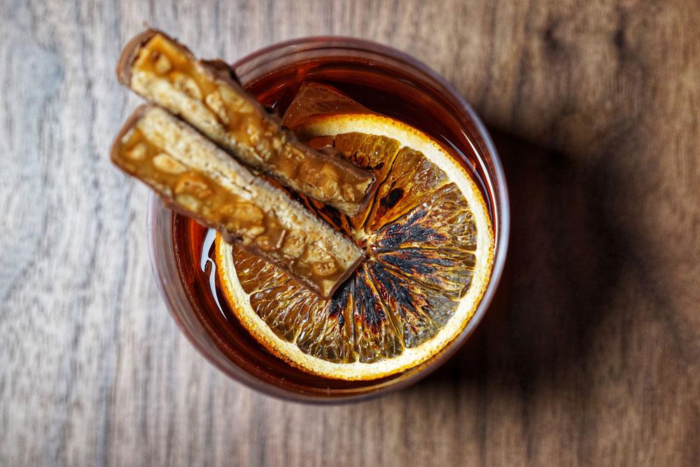 Next up, the unflawed combination of whiskey, Campari and sweet vermouth is smooth as silk in an Aged Boulevardier (RMB85) garnished with a charred orange slice and two slivers of a Snickers bar. This classic riff on a negroni gets a balance of sweet and bitter just right.