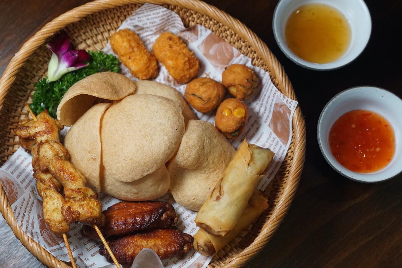 Traverse Khaosan Road in one hit with the Street Thai Snacks Platter (RMB80) – a bamboo basket filled with all manner of fried nibbles – crispy fish and shrimp balls, chicken wings, fried spring rolls stuffed with curry-seasoned ground pork, succulent chicken satay skewers, crackling shrimp chips and Thai sweet chili and plum sauces for dipping.