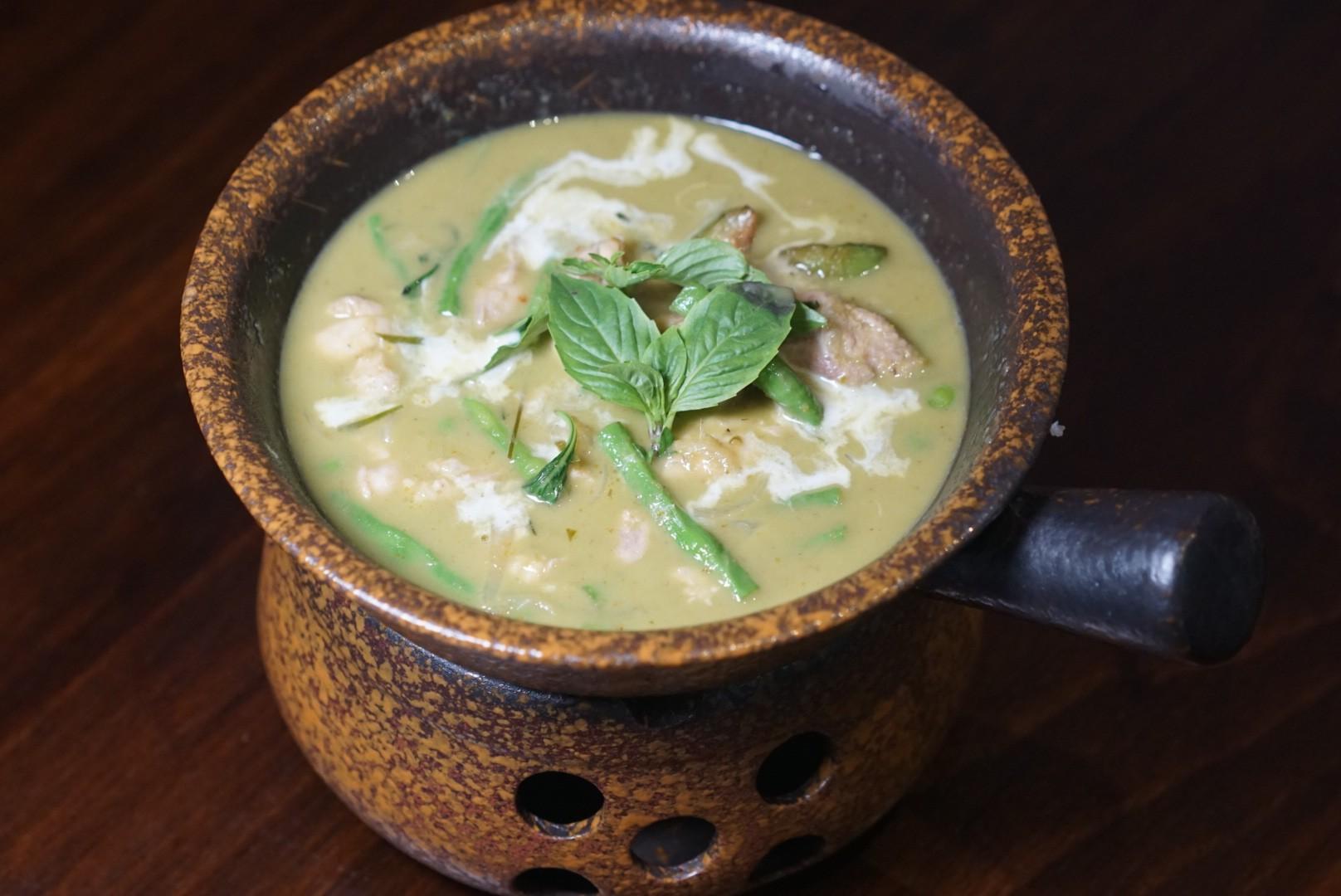 A verdant Green Curry Chicken (RMB58) is thick with coconut cream. Bobbing green beans and chunks of chicken in various sizes float along the top, swelling with the curry’s lemongrass-forward spice.