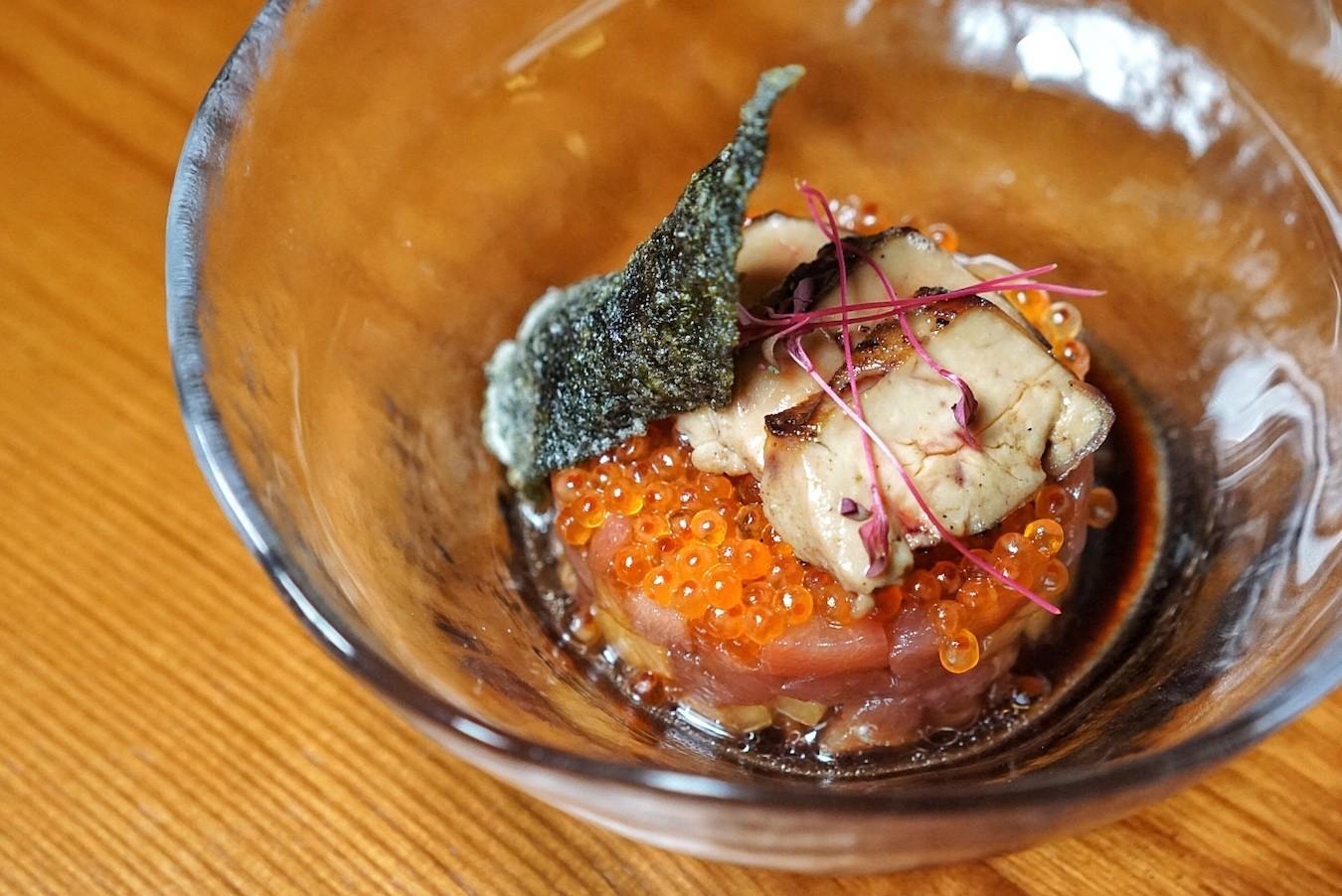 Diving deeper into the menu, food arrives in sharing size ‘tapas’ portions, with punchy seafood and meat permutations like Bluefin Tuna Tartar (RMB168) paired with sake-soaked foie gras, cubed plum and glistening beads of sour teriyaki-soaked ikura.