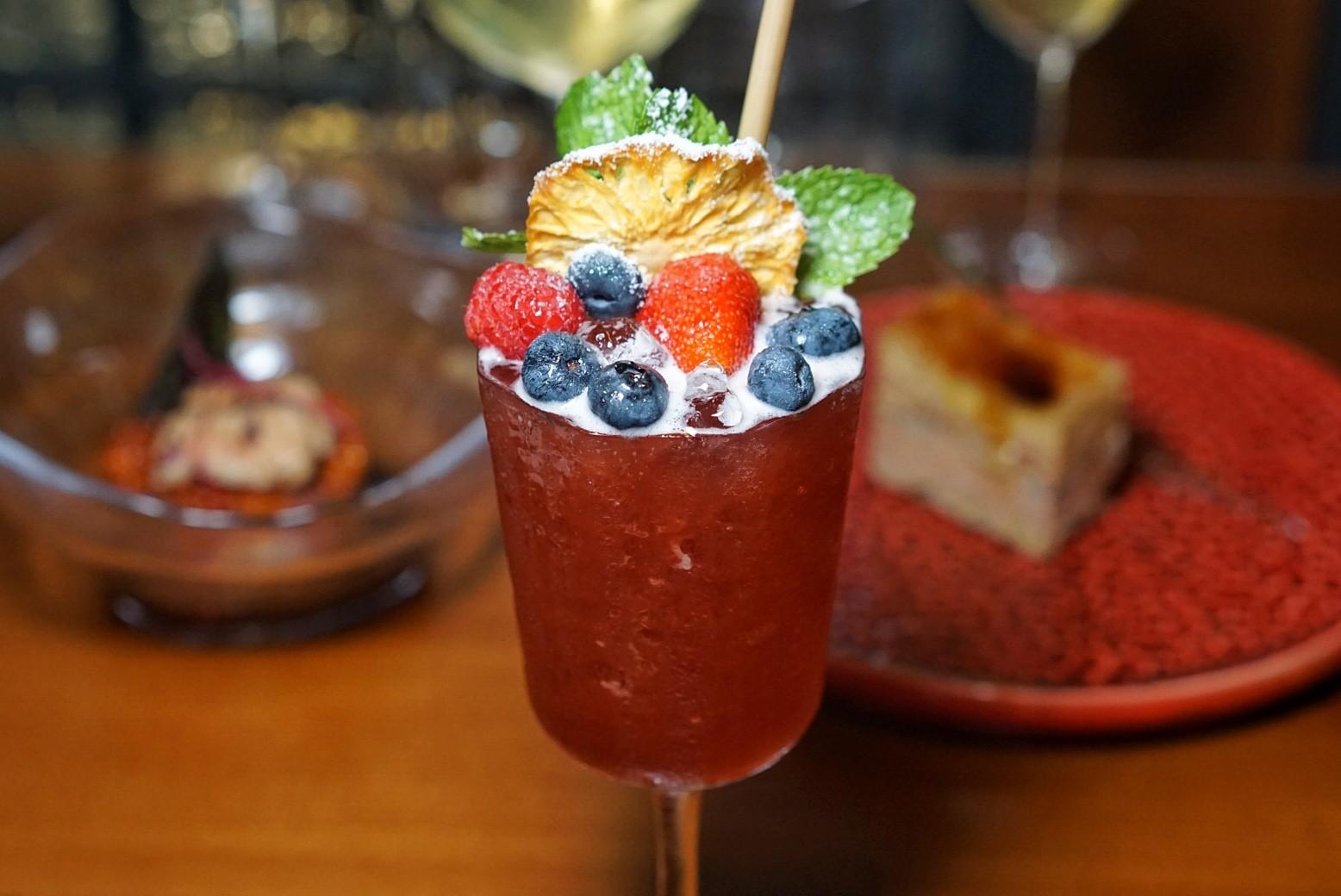 Tart, like the dessert it’s named after, the latter is made with fresh lemon, strawberry ‘ichigo’ jam and pineapple, bedazzled with a mix of powdered sugar-dusted fresh berries, a dried pineapple wheel and sprigs of mint.