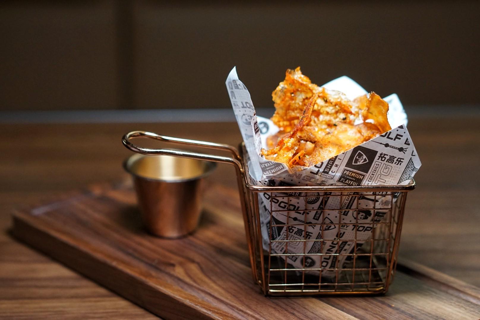 Snacks begin with Crispy Pig Ears & Cracklings (RMB68) served with a spiced aioli or Salted Egg-Yolk Potato Chips (RMB38).