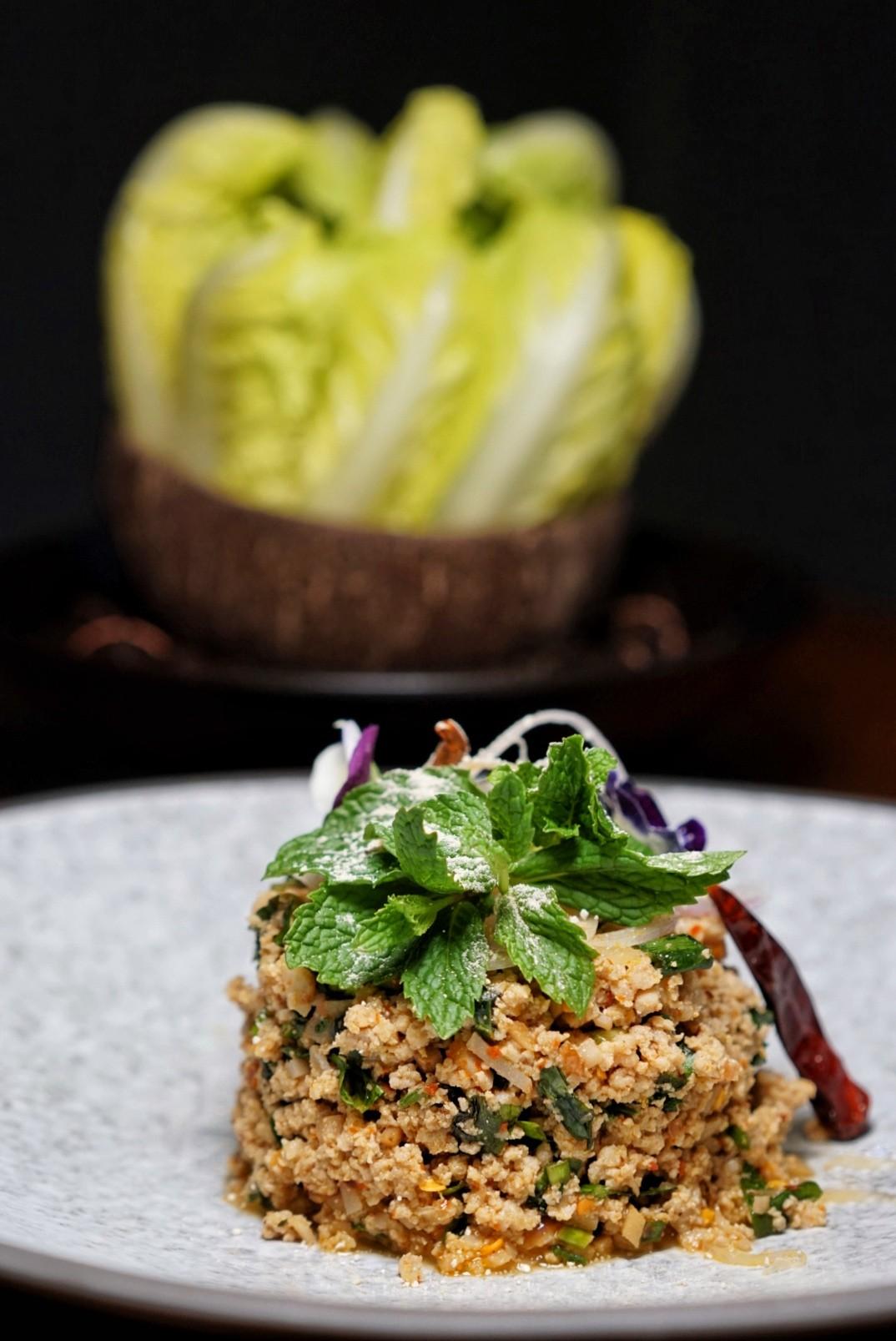 Begin with a traditional northern salad, Larb E-San Moo (RMB118) – a base of spicy, minced pork, tossed with roasted sticky rice powder, chili, mint, and lime – scooped onto a wrap made from fresh lettuce and crunchy endive leaves.