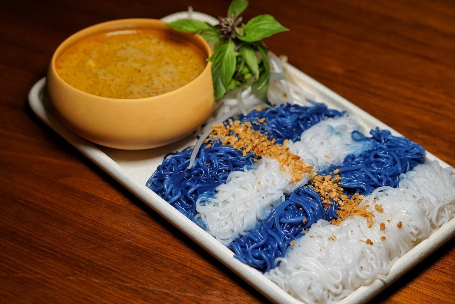 Chock-full of tender crab meat flakes, the Kanom Jeen Narm Ya Pu (RMB138) is an authentic Thai creamy coconut crab curry, paired with alternating tulles of pea flower-dyed rice noodles and customary white rice noodles for dipping into said curry.