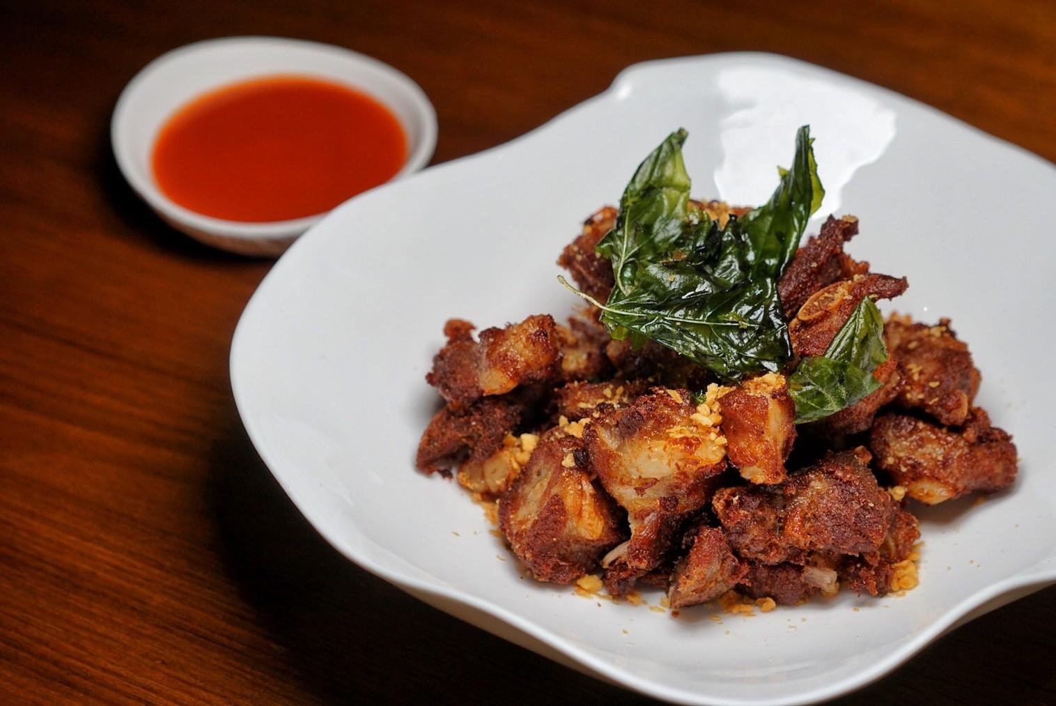 First fried, then grilled, the pork morsels are best enjoyed with galangal, sriracha chili dip and rice, just like Chef remembers eating it during her childhood.