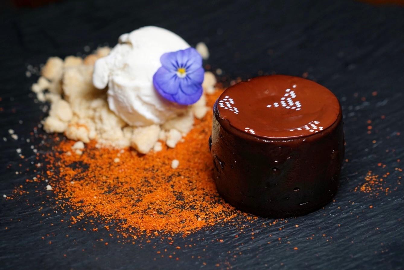A rich chocolate torte with a pudding-like center is dusted with mild chili powder – first for aroma, yet quickly followed by a piquant kick – best balanced by the coconut ice cream served alongside it.