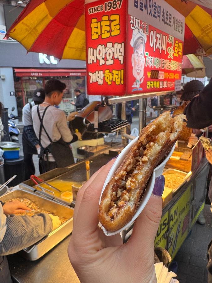 BIFF Square: A buzzing walking street for shopping and snacking, BIFF Square is renowned for its delicious and affordable street food, such as hotteok (brown sugar filled pancakes with cinnamon, sunflower seeds, pumpkin seeds, and peanuts), tteokbokki (rice cakes), and various skewers, especially at night. In addition to food, the area is a shopping street with a variety of international and local brands. Just off of BIFF Square, visitors can stop by Yongdusan Park to enjoy the cherry blossoms in spring and pagoda views.