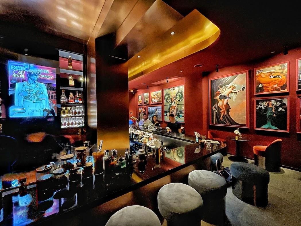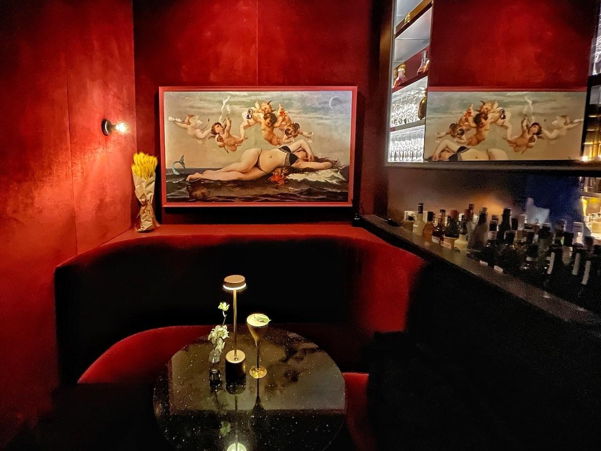 The lush décor – with crimson red velour walls and plush couches accented by black and varying shades of gray – is one step away from a tarot card reading den, riddled with occult, voodoo-esque symbols plus planet and star motifs throughout.