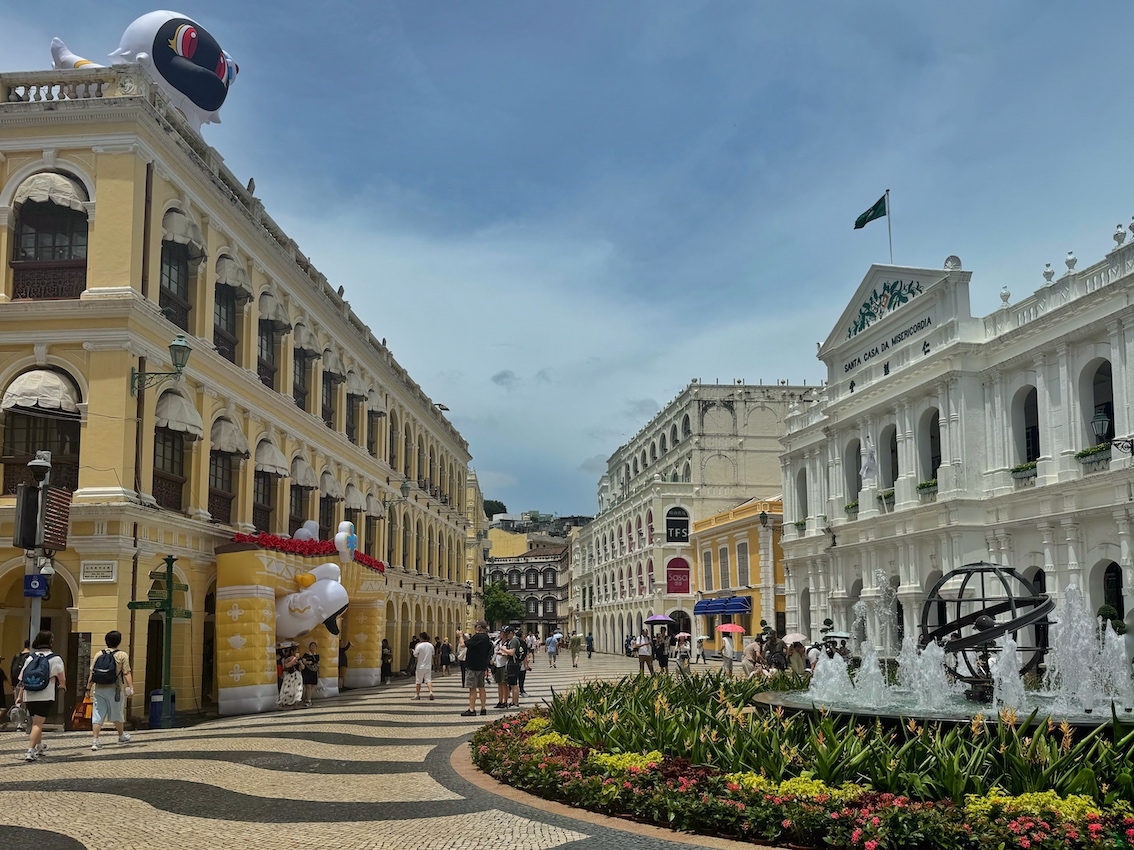 Next, pass by the canary yellow St. Dominic’s Church to Senado Square. This pedestrianized UNESCO World Heritage site boasts black and white wave-patterned Portuguese mosaic paving and pastel-colored neoclassical buildings, like the Holy House of Mercy. The square serves as a bustling hub that connects both historic sites and modern shops, cafés, and restaurants.