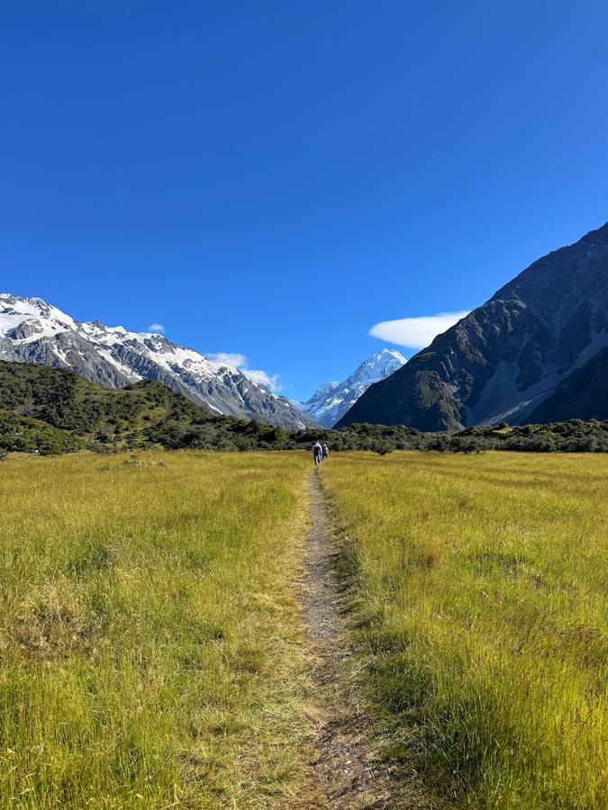 One of the most popular hikes in the area is the Sealy Tarns Viewpoint Track, also known as the "Stairway to Heaven." This moderately challenging hike involves – as the name implies – a lot of stairs but rewards with incredible views at the summit overlooking Aoraki (Mount Cook), the Hooker Valley, and surrounding glaciers. Starting your hike early (by 9am) will allow you to enjoy the tranquility of the area before the crowds arrive. The entire hike takes 2-3 hours at a moderate pace.