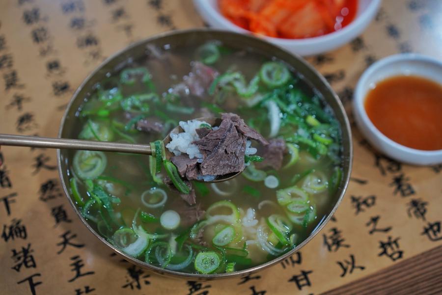 A warming soup made from long-simmered beef bones, marked by its milky-white broth. Often prepared with cuts like brisket, shank, or oxtail, gomtang is usually served with rice and/or noodles, garnished with green onions.