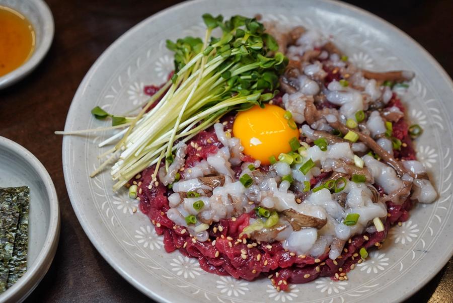 Yukhoe Jamaejip Head Store: Situated in Seoul's Gwangjang Market, this busy restaurant is notable for its raw beef dishes like yukhoe (beef tartare) with still squiggling raw octopus (san-nakji), yukhoe bibimbap, and yukjeon (beef pancakes). It’s common to have a wait due to its popularity, so go early and put your name down.