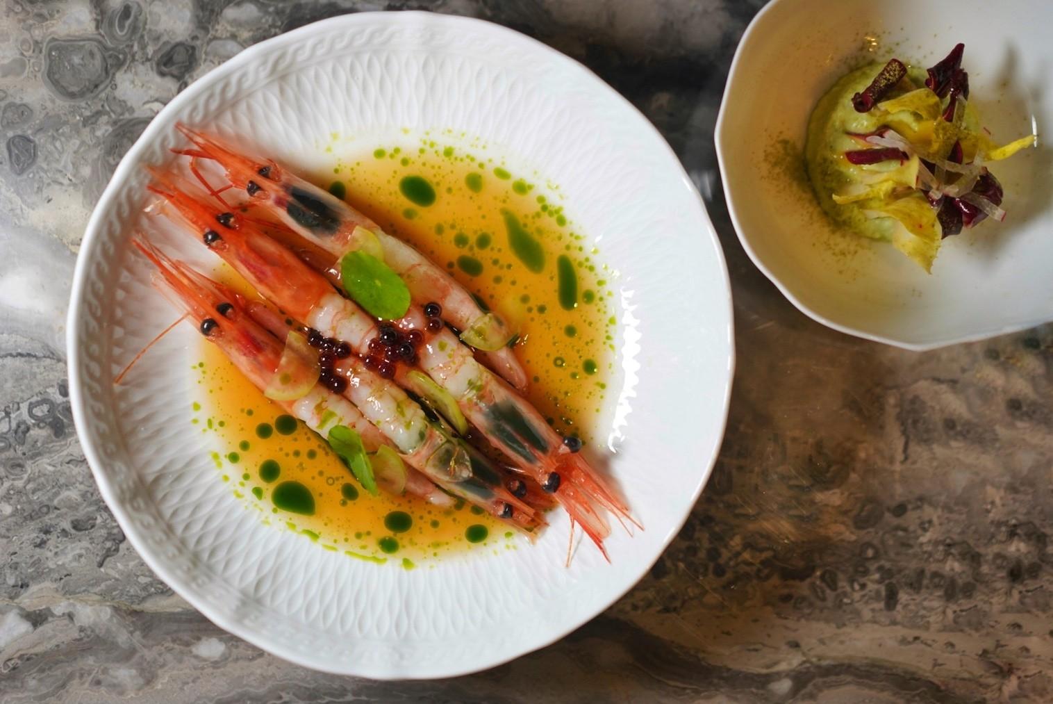 Inspired by Jiangsu and Zhejiang’s drunken shrimp and crab dishes, the Drunken Arctic Amaebi (RMB129) presents diners with velvety sweet water prawns swimming in an 18-year Shaoxing yellow wine, daubs of sweet basil oil floating on the surface. Beads of vinegar 'caviar' pop for an added layer of sour complexity.