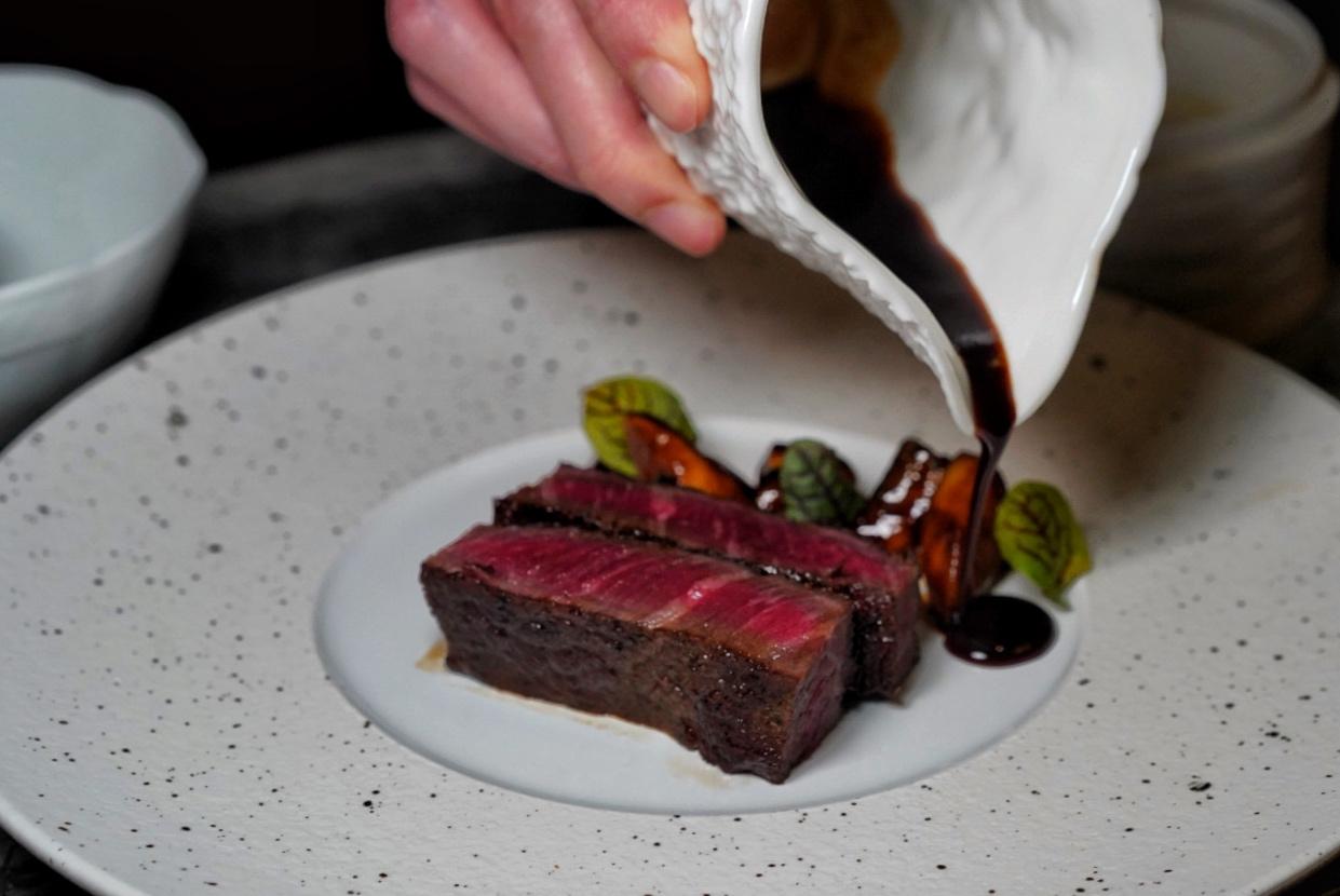 The plate combines the flavors of Shanghainese sweet and sour pork ribs with high-grade steak, the unctuousness cut by pickled porcinis.
