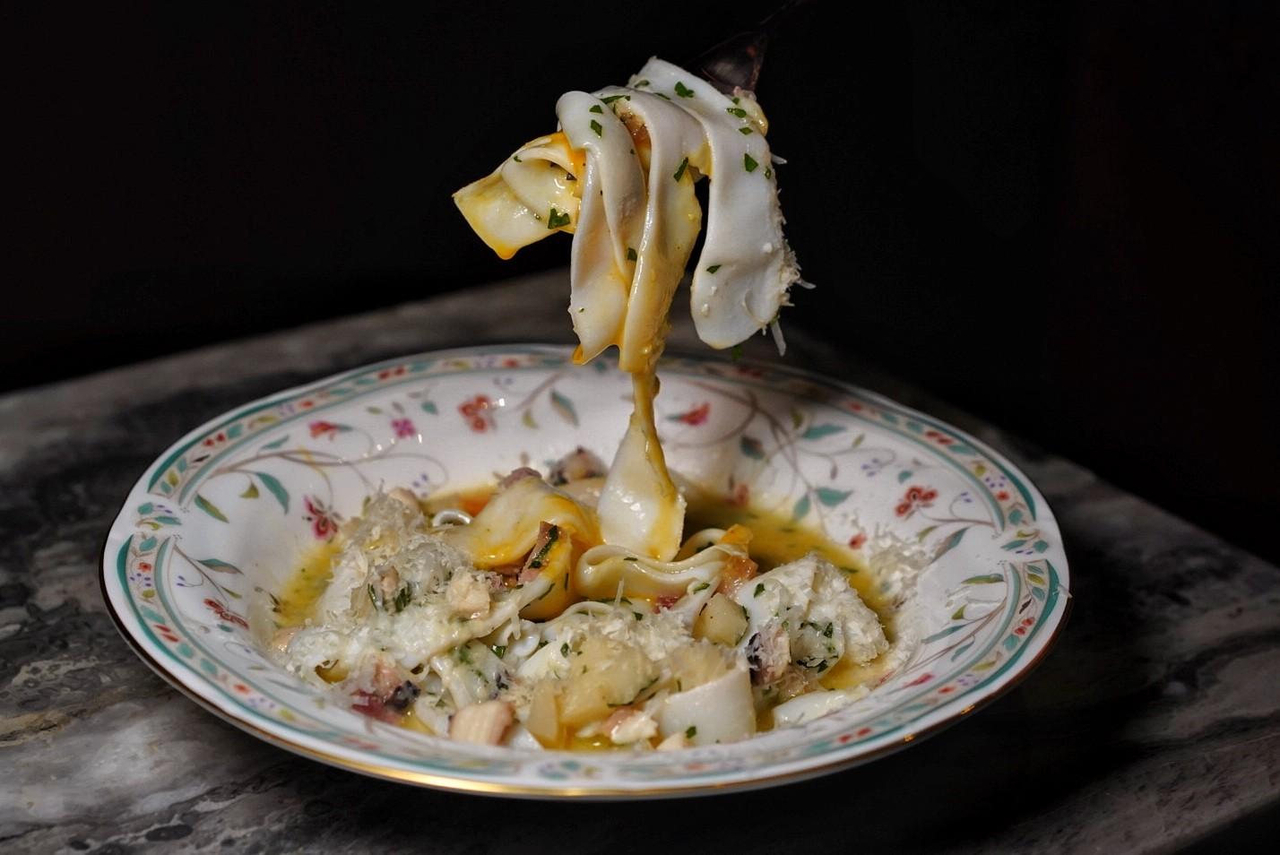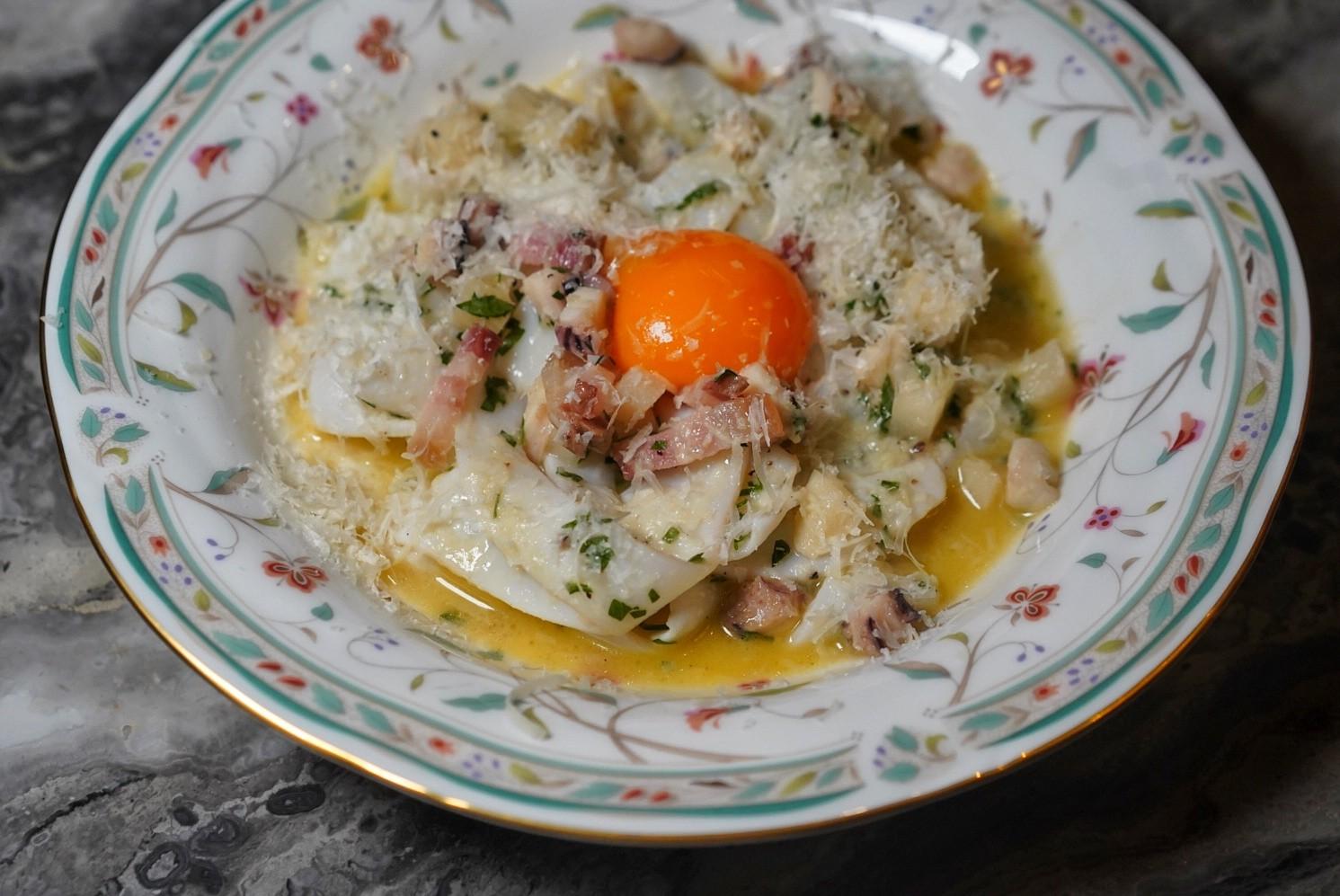 A carb-free alternative to pasta, the thicker end of cuttlefish is flattened and sliced into springy noodles of sorts, plated with bamboo shoots, crispy pancetta slivers, freshly shaved parmesan cheese, and a sous vide egg yolk as the Cuttlefish to “Noodle” (RMB159).