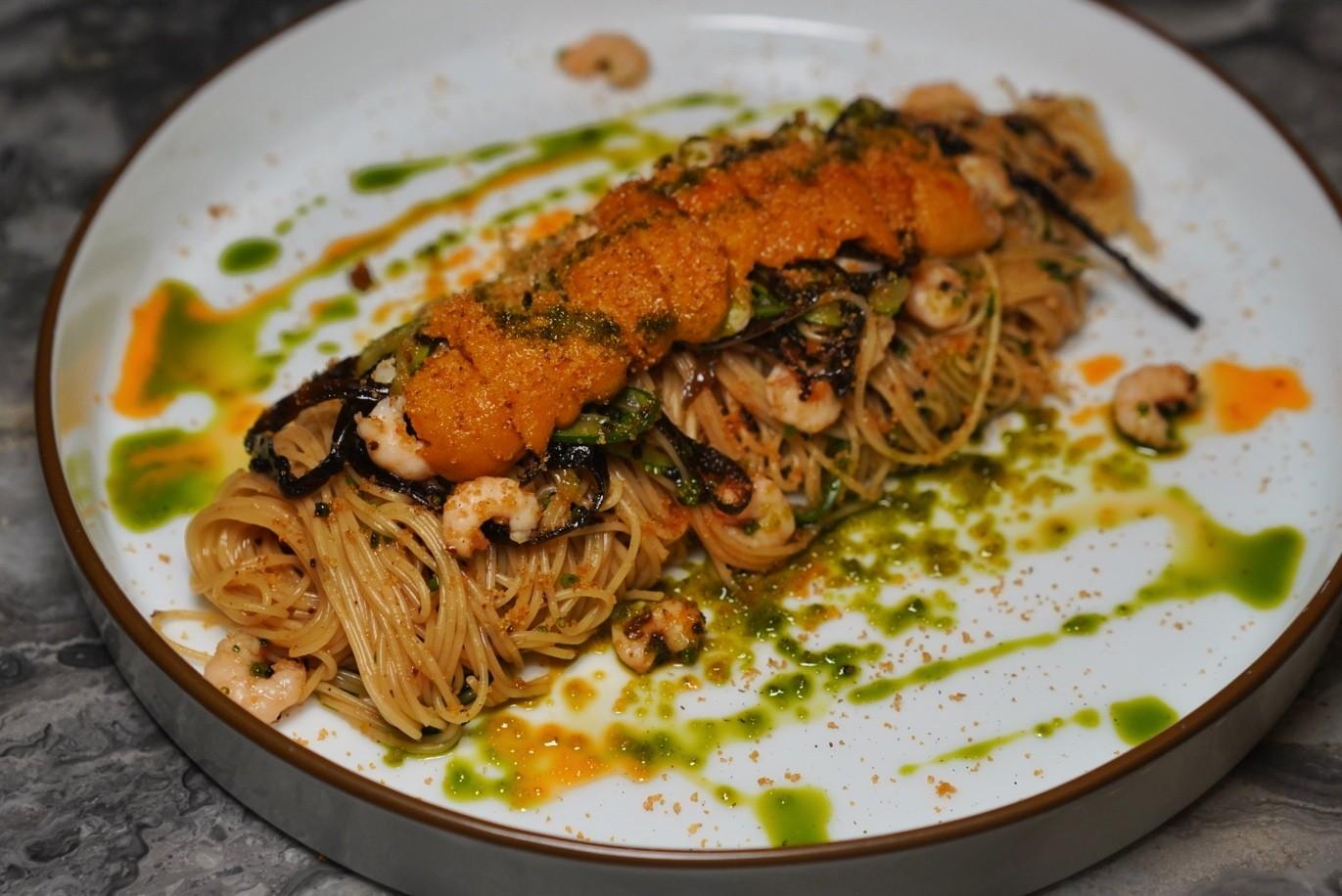 Merging elements of Shanghainese scallion oil noodles (葱油拌面) and Suzhou’s three shrimp noodles (三虾面) with Italian pasta, the Sea Urchin Angel Hair Pasta (RMB199) showcases thin noodles slick with a smarmy sauce of sea urchin, scallion oil and bottarga roe.