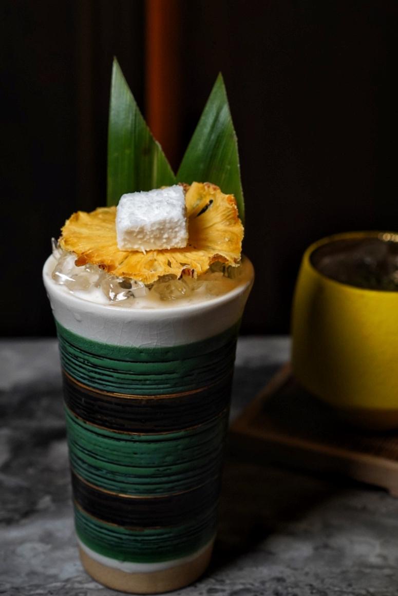The Thai Cooler (RMB110) serves up Laksa leaf-infused dark rum shaken with apricot brandy, coconut, lemon, and pineapple juice for a pina colada-like sipper, garnished with a dried-pineapple slice and coconut mochi.