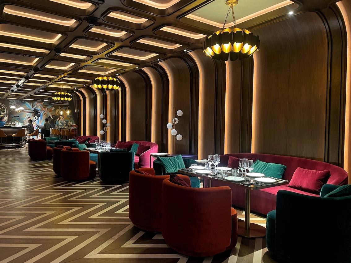 An alternative to the whimsical Lounge libations, the club has a more traditional cocktail menu served along the custom-built 10-meter bar, with drinks centering around speed and efficiency, many of which involve twists on beloved classics. In addition to cocktails, there’s also a 450-bottle wine cellar.