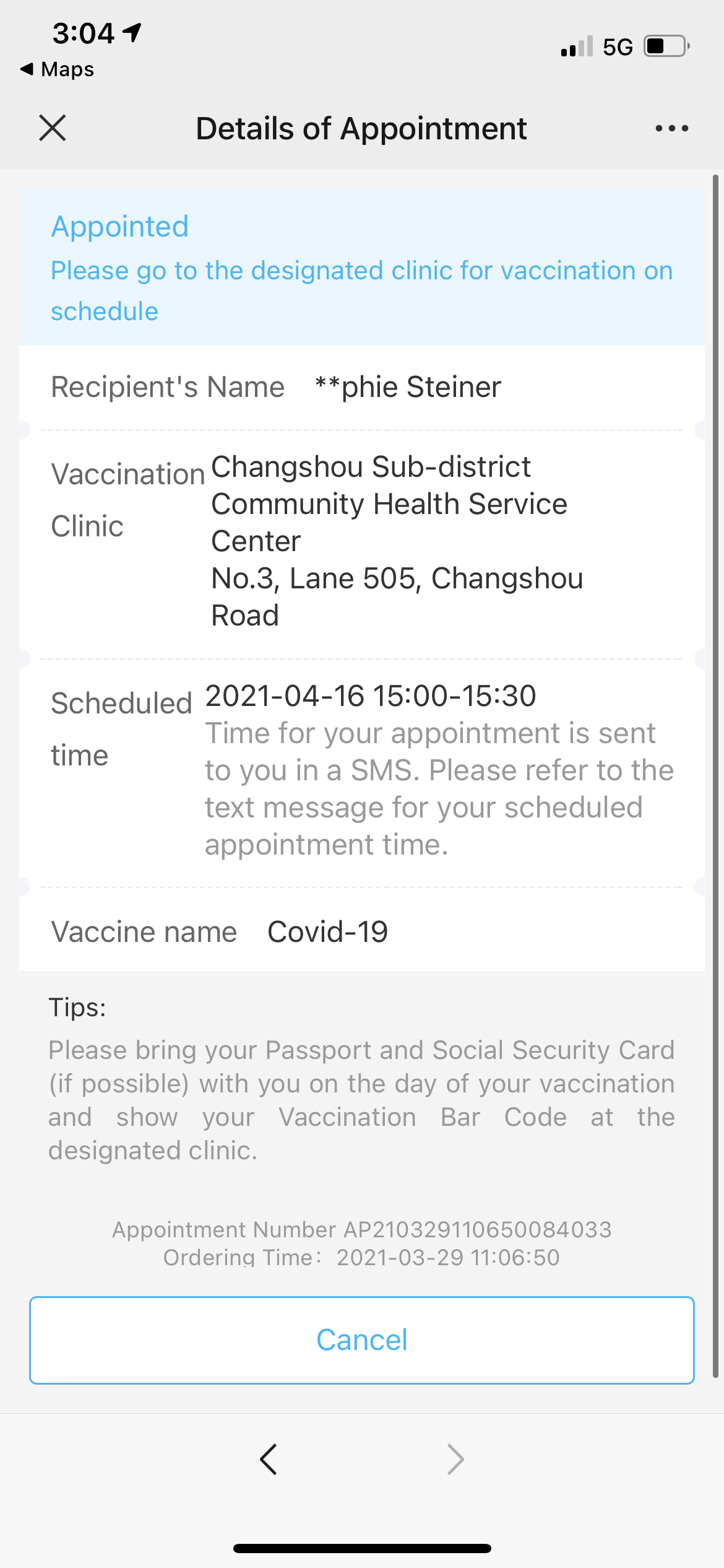 I showed up at the Waitan Sub-District Community Health Service Center on Ningbo Lu 15 minutes before my appointment to find out that my vaccine location had actually been reassigned to an address closer to my home after I had received the initial confirmation of location. Luckily, the staff was nice enough to show me how to easily double check my new vaccine location in the app, and off I went to the correct location on Changshou Lu.