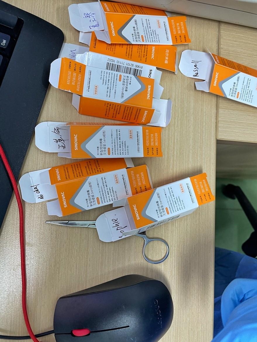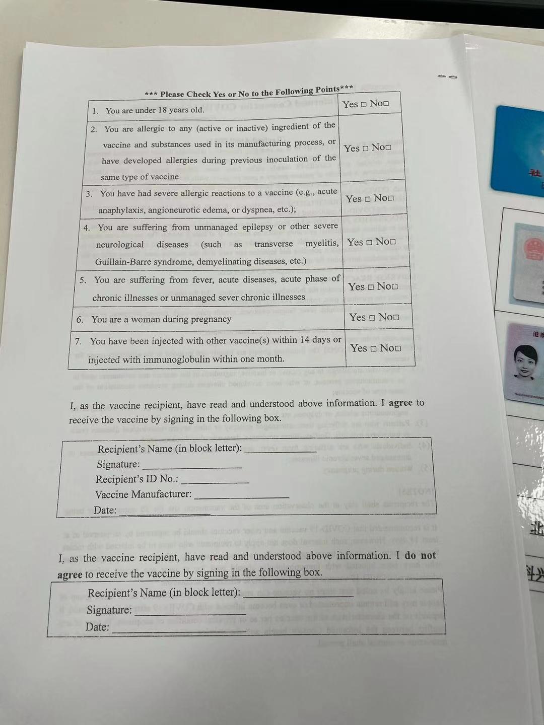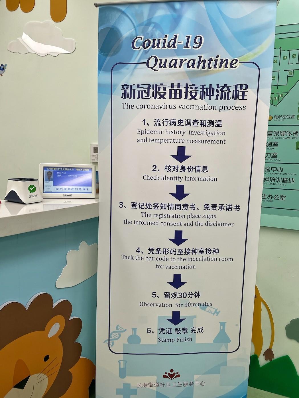 Arriving at the testing center, there is a separate check-in for foreigners with English speaking staff. The person at the front desk will photocopy your passport, have you sign a consent form, let you know which vaccine you are receiving (Beijing SinoPharm, Wuhan SinoPharm or Sinovac) and pull up a barcode that will be used for tracking purposes. Next, you will be charged RMB100 , which can be paid via Alipay or WeChat