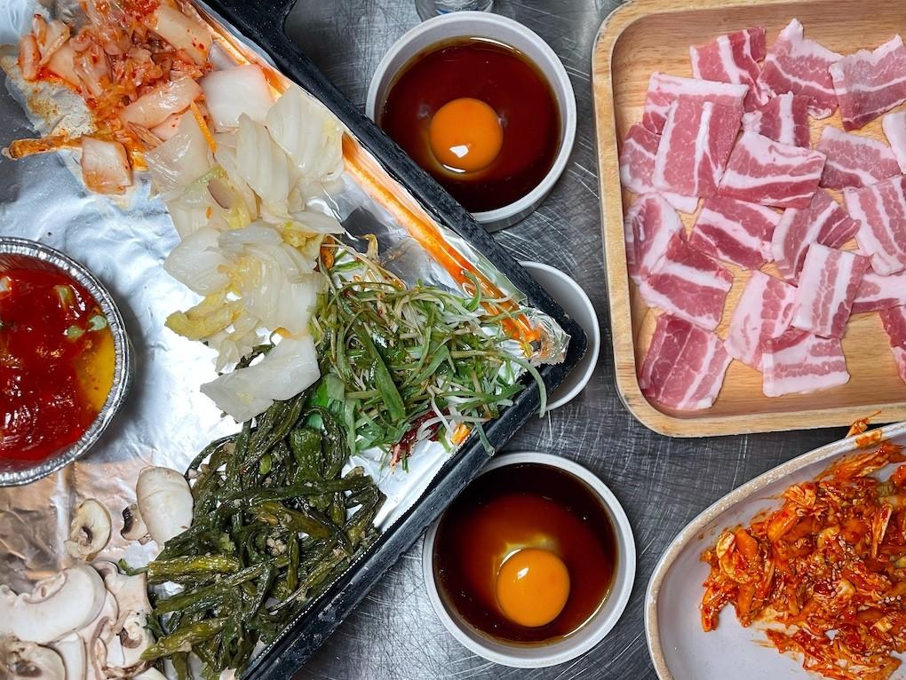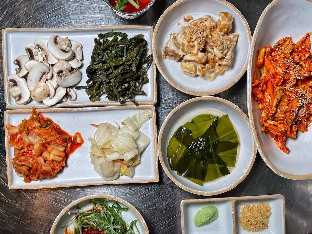 The meat is cooked on square, aluminum-foil topped table grills, along with a variety of banchan (or side dishes) like sliced mushrooms, string beans, kimchi, pickled cabbage and sprouts.