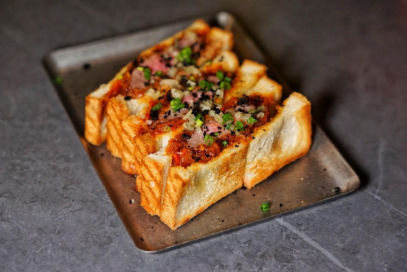 For an actual meal, the Iberico Pork Sando (RMB98) is what you should order – but it’s cut into six portions if you’re friendly enough to share. A thick slab of marinated pork tenderloin is lightly breaded and fried, smothered in a BBQ-sauce-level-of-tanginess tomato chutney, and finished with a hit of Yunnan truffle, all on white bread.