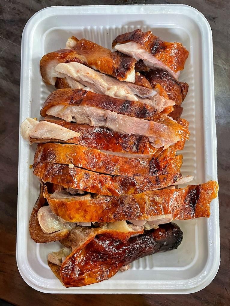 The roasted alternative sees a crispier, darkened skin, pulling away to reveal tender flesh below. Most commonly, the duck is served with a sweet and savory soy garlic sauce for dipping.