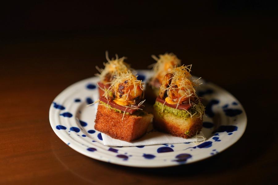 Bar bites, by famed Chef Amninder Sandhu, are elevated interpretations of global comfort fare, like lobster and guava toast, succulent Naga pork sausage with fermented bamboo shoot ice cream, and the flakiest Gol-Gol bread slathered in chili fennel butter.