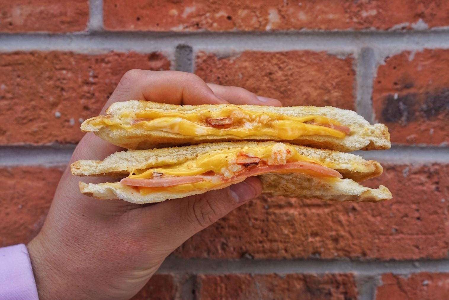 Luncheon meat ham, lukewarm American Kraft singles-style rubbery cheese that barely qualifies as melted, a fat dollop of that same overly sweet mayonnaise (we swear they add sugar to it) and the tiniest smidgeon of lobster meat is all smooshed between two paper-thin slices of marginally toasted, flavorless, textureless white bread. Why? Just why?