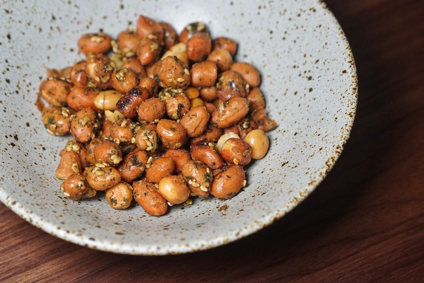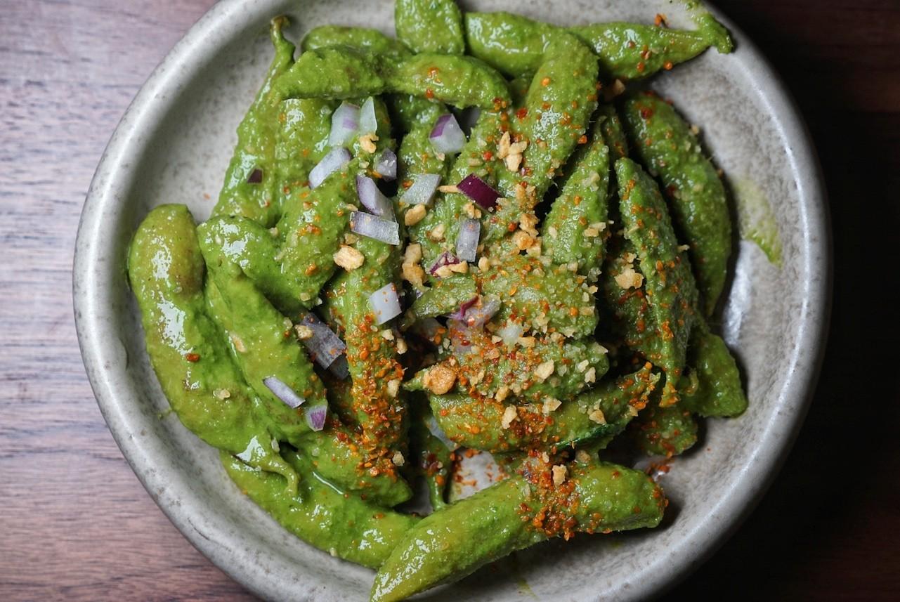 Appetizers begin with a bowl of candied Coriander Peanuts (RMB28), sweet and crunchy to pair with other bites like garlic-forward Edamame with Mixed Pesto (RMB28) – served cold and seasoned with cumin, chili powder and raw onions. The pesto is spiced and herbaceous, a solid snack for sipping wine.