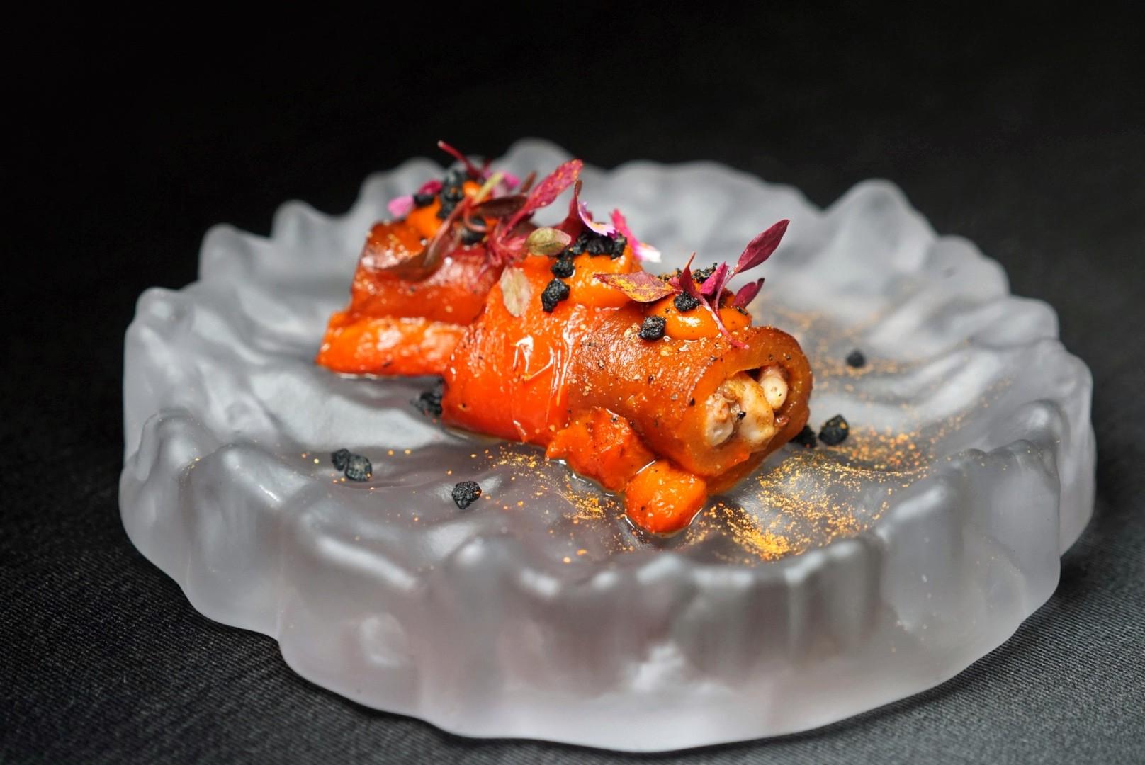Each dish is presented in a monochrome color palette, showcasing a traditional Chinese color – good fortune red, royalty yellow, healing green, authority black, love purple, etc. A key component of the menu is balance – a balance of yin and yang, a balance of light and dark, a balance of spice and sweet, a balance of soft and firm.