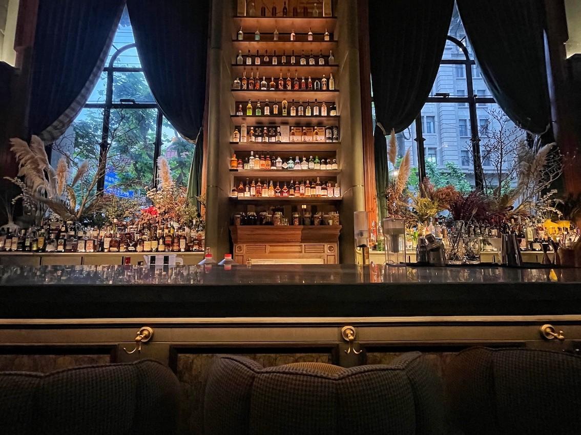 Floor-to-ceiling windows offer a sprawling view of Shanghai’s downtown, while a low set onyx ceiling guides the eye to a glowing, gold-lit spiral staircase centered on a marble platform, flanked by shelves stacked with more than 400 varietals of wine.