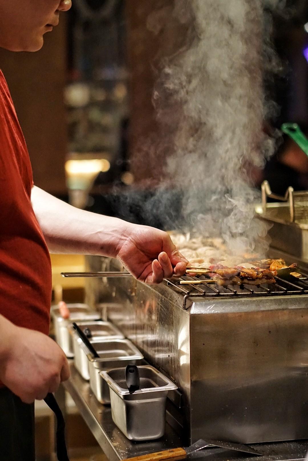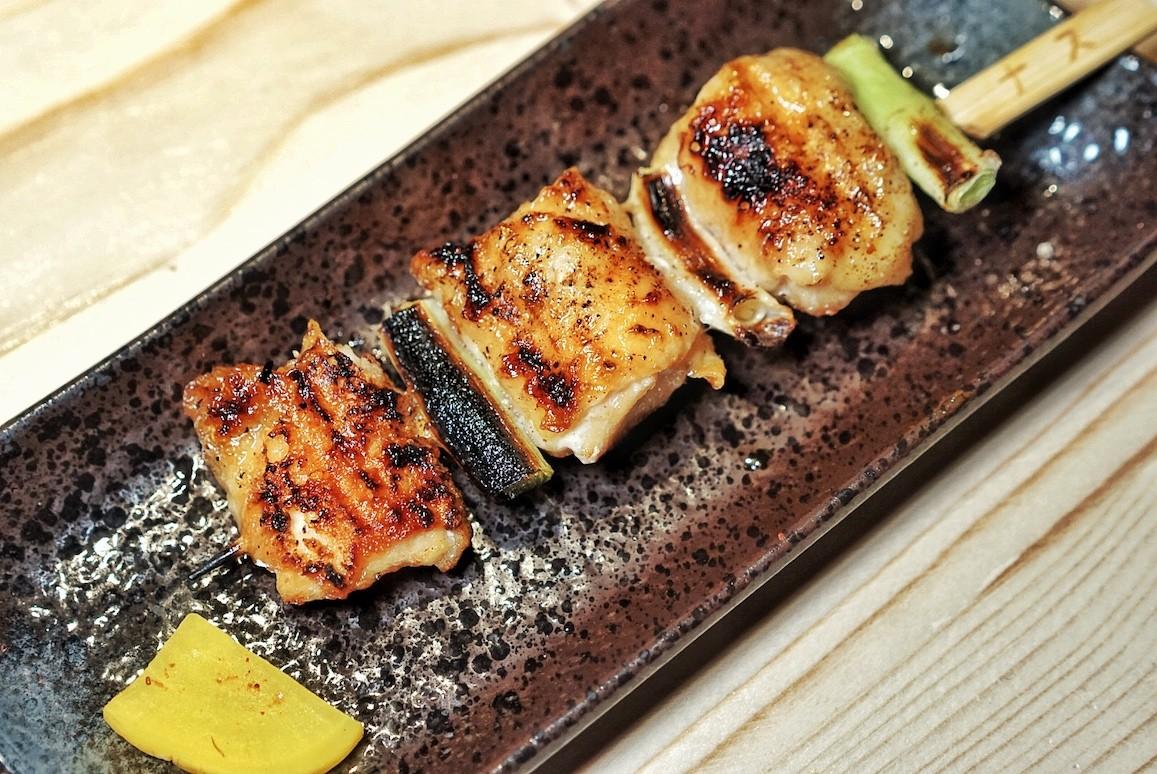 The emerald green tufted sofas and lounge chairs fit the jazz music emanating from the speakers, creating a whiskey and cigar bar vibe that seems like a curious choice for a Japanese yakitori spot – a place that usually involves a bustling shotgun bar with smoke-laden layers of controlled chaos composed of speedy skewers and flowing highballs.